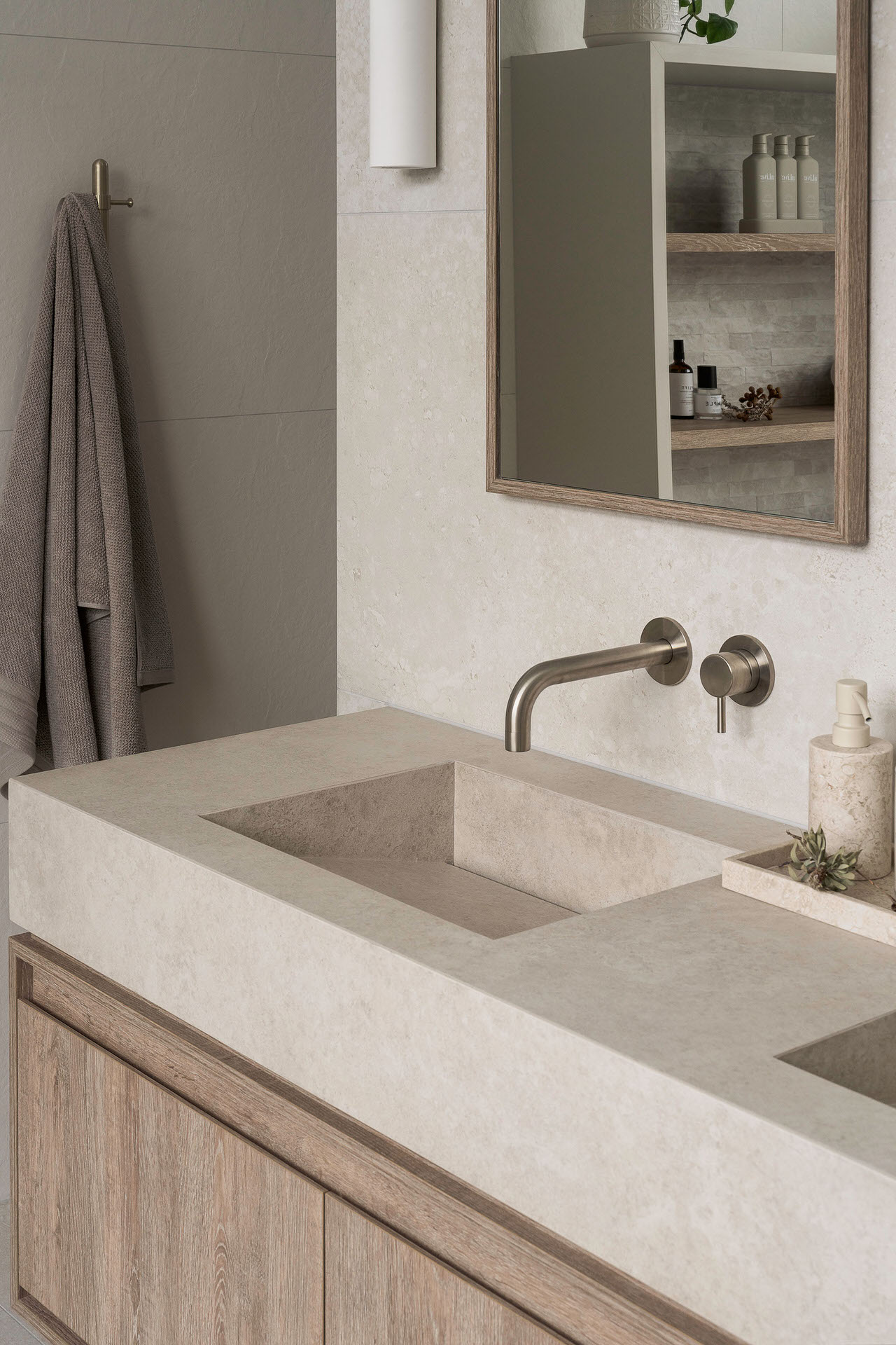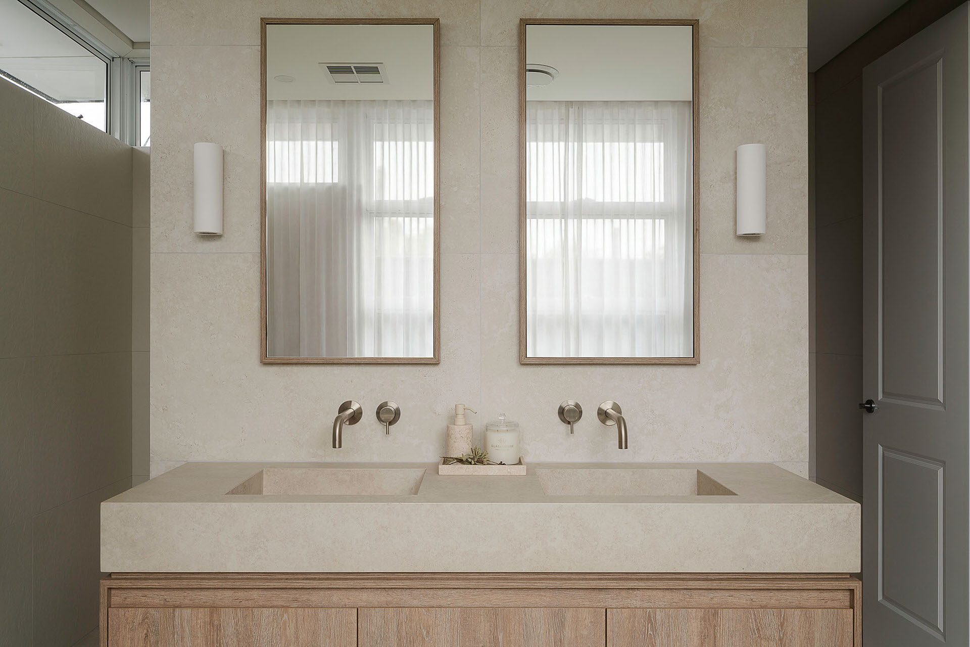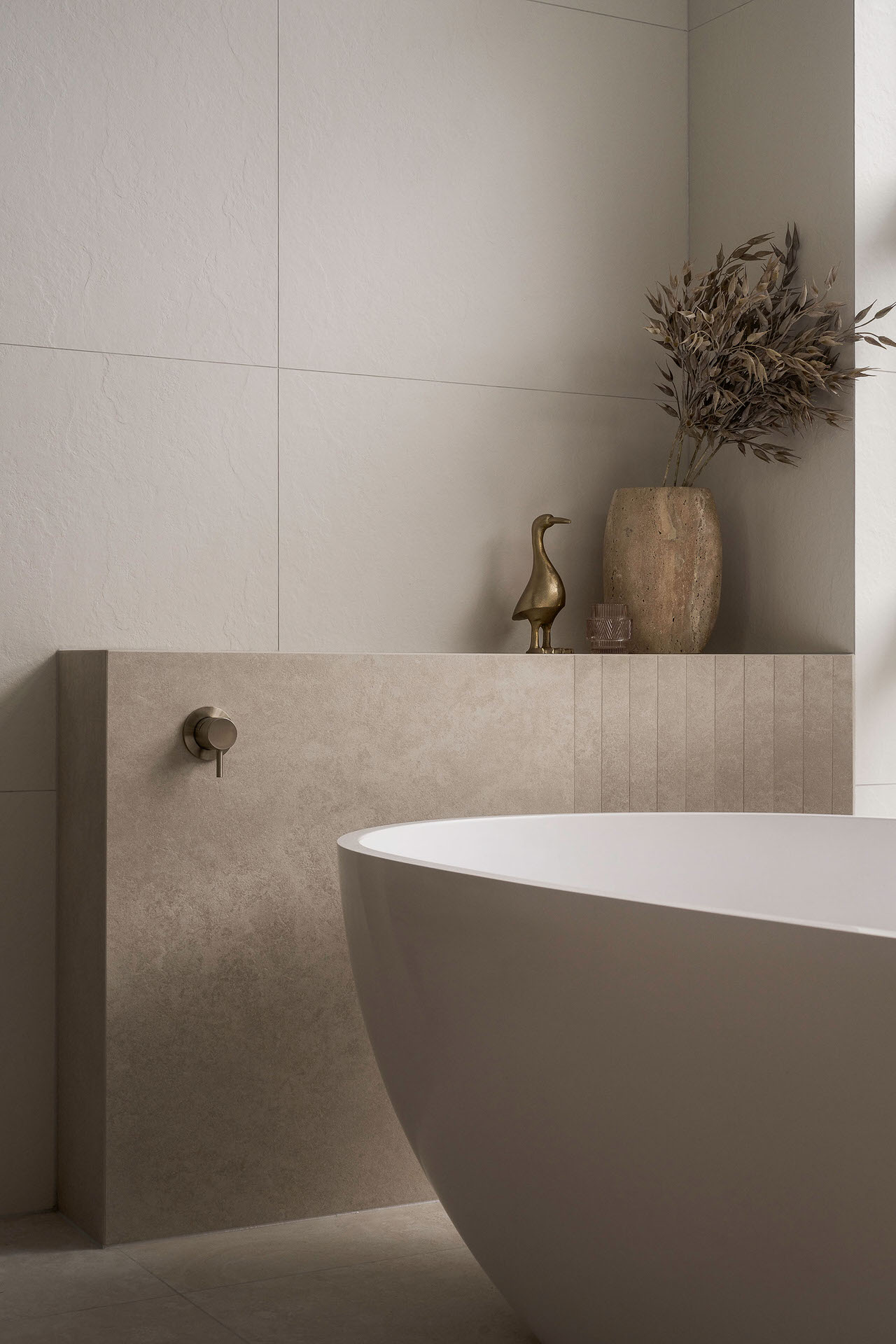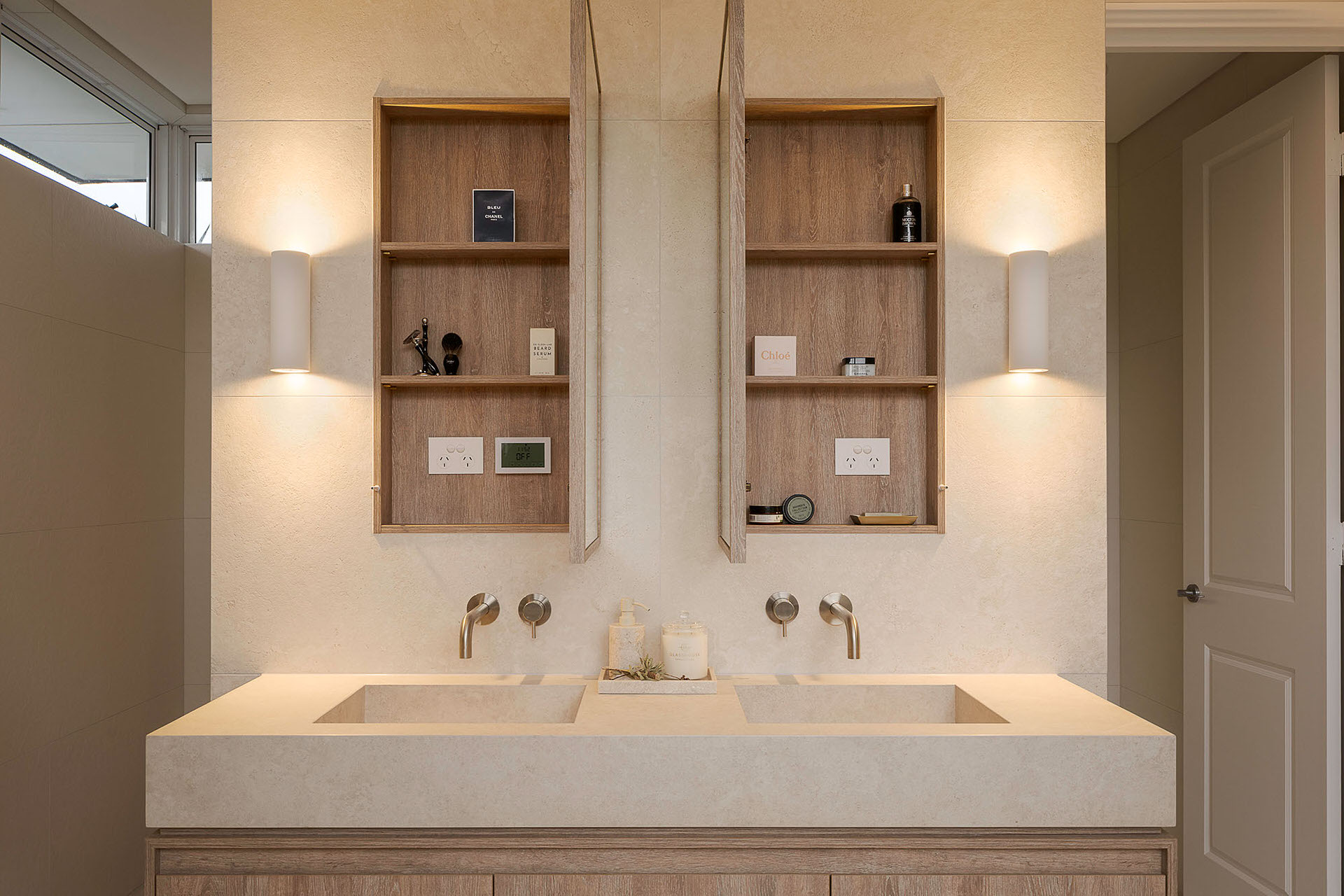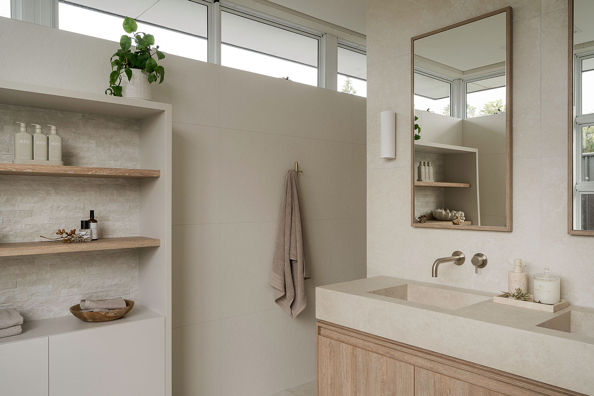 A defining feature of the ensuite is the curved nib wall, which introduces softness to the architecture while serving a dual purpose. Acting as a bath-side ledge for devices, it subtly reflects the client’s lifestyle while maintaining a clean, sculptural presence within the room. Bespoke joinery plays a central role in maximising storage without visual clutter. A custom vanity with internal drawers provides layered, highly functional storage, while integrated laundry cabinetry and recessed mirror cabinets are concealed for a seamless, uninterrupted finish. A light, natural palette is elevated with textured tiles a complementary feature finish, adding depth and warmth. The result is a cohesive, tranquil ensuite that feels considered, functional, and effortlessly calm.