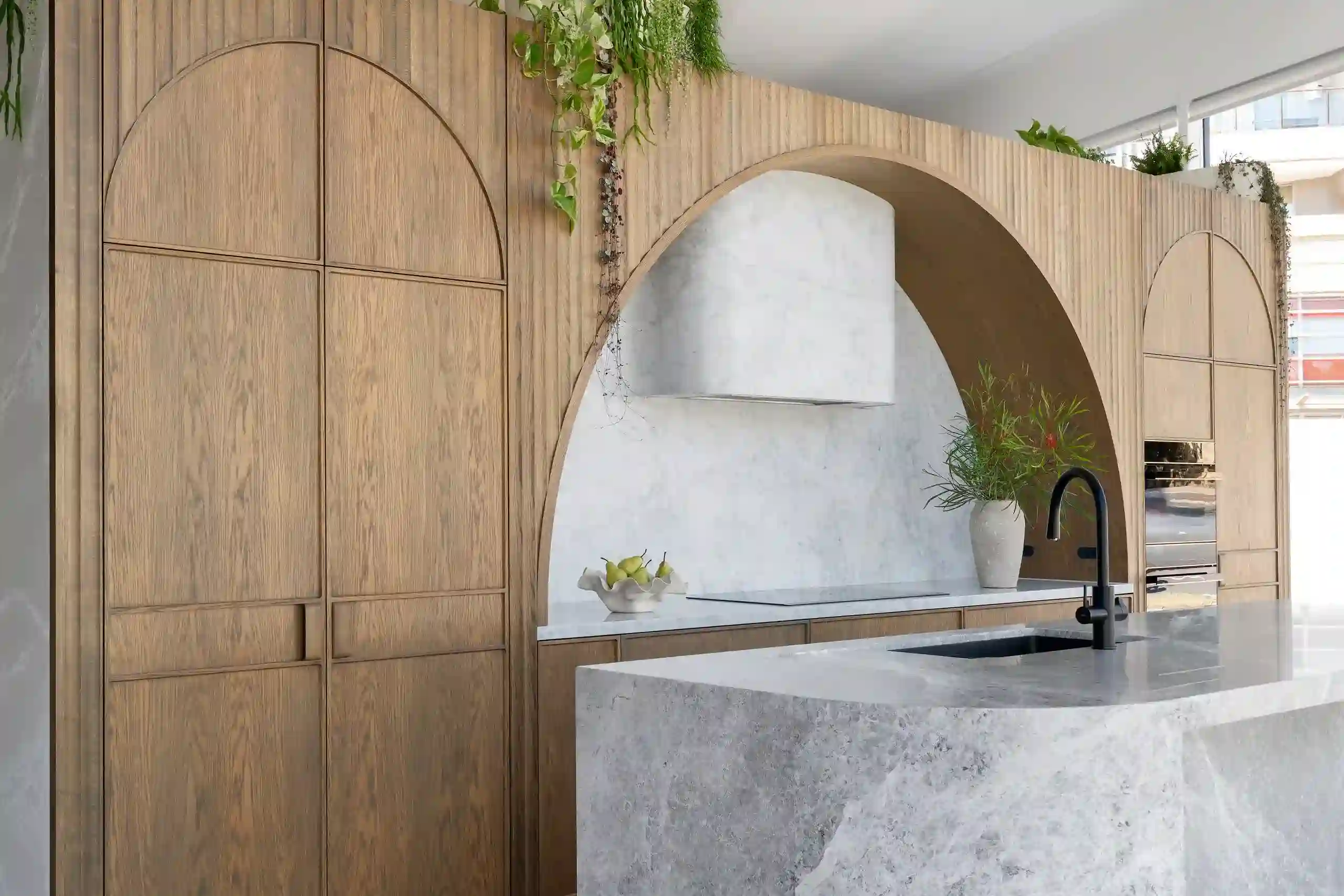 The Lux Interiors Showroom epitomises innovative design and luxury craftsmanship, showcasing five distinct spaces that seamlessly blend beauty and functionality. The Kitchen, with its stained American oak cabinetry, scallop details, and curved stone island bench, combines elegance with practicality. The Living Room features custom cabinetry with bronze mirrored glass and Pink Patagonia Quartzite, creating a striking and timeless ambiance. The Main Bathroom highlights a unique curved green slate vanity, a curved wall around a round bath, and brushed nickel tapware, blending luxury with functional design. The Master Suite, under three curved archways, showcases Navurban Smokey Oak cabinetry, large porcelain slabs, and a curved shower wall in white kitkat tile, offering a grand yet intimate experience. The Reception Desk, crafted from Pink Patagonia Quartzite and encased in white coved cabinetry, sets a cohesive tone with the Venetian plaster walls throughout the entire studio. Each space in the showroom is meticulously designed to deliver a memorable and sophisticated client experience.
